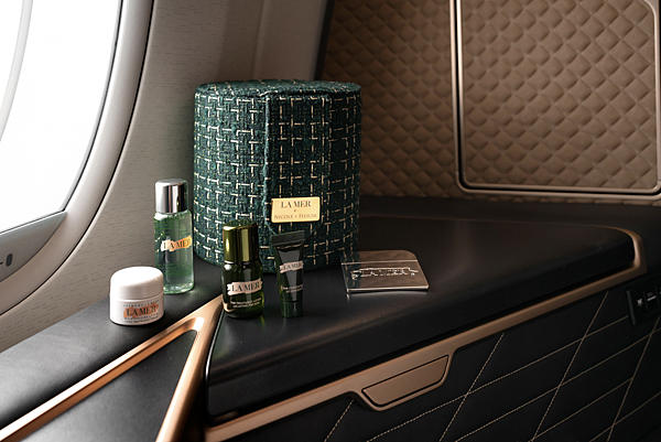Nicole+Felicia打造、全球限量的「手工高訂臻藏化妝箱」,以LA MER的經典綠色為主色,由設計師將婚紗中最要求的細膩美感,轉化為一針一線的手工觸感,典雅細緻,限時限量回饋給LA MER的VIP及搭乘星宇航空由台北出發前往舊金山的頭等艙、商務艙旅客,內容物包含明星商品:海洋拉娜潔膚凝膠30ml、超能修護精華露15ml、濃萃修護精華3ml、海洋拉娜乳霜7ml、品牌化妝鏡,讓旅客在機艙內也能保持容光煥發,迎接接下來的旅程。