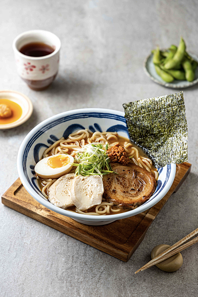 麦水塩共推出7款特色風味麵和2款丼飯,麵食部分除了季節限定款,最熱賣的2款是「炙燒豚滿肉細烏龍麵」和「辛肉味增叉燒」。「炙燒豚滿肉細烏龍麵」湯頭為日式原汁原味的豚骨熬製,細烏龍麵吸附湯汁更加Q彈滑順,口感清甜濃郁卻不膩口,鋪滿四片厚豬叉燒,上桌前將其炙燒,更激發叉燒的香氣,唇齒留香;「辛肉味增叉燒」則是喜愛辣口味的民眾必點,一碗擁有舒肥雞及豬叉燒的雙肉享受。