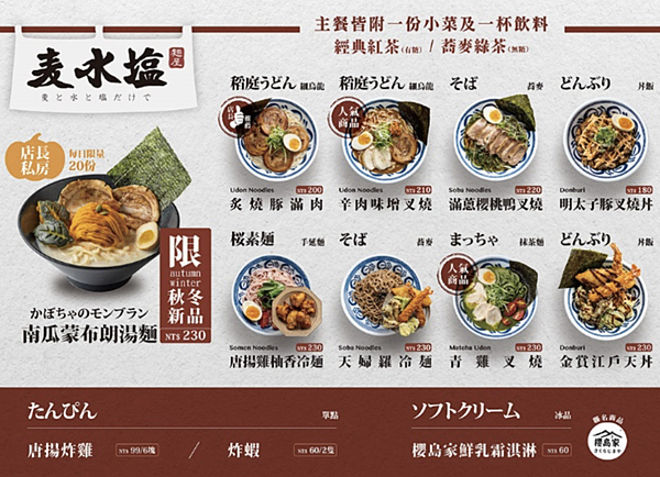 台灣拉麵品牌由松園食品公司獨資創立的「麦水塩麵屋」,自9月試營運以來不論是創新口味或是麵條口感都獲得大批消費者喜愛,首家店設立在台中大遠百12樓大食代美食街,近期再推出季節限定「南瓜蒙布朗湯麵」,採用法式甜點蒙布朗手法做成南瓜泥,搭配豚骨湯頭和炙燒肉片,先嘗幾口豚骨原湯,再拌入南瓜泥如南瓜濃湯,獨家細烏凍麵條,巴著南瓜香氣Q彈帶勁,增添湯韻厚度,一碗滿足溫暖、香甜、美味的好滋味!
