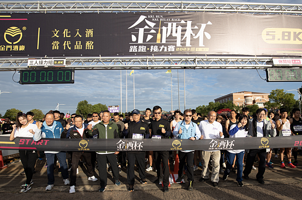 金門酒廠主辦的『第一屆金酒杯路跑▪接力賽』活動,於今日 (11月19日)清晨7:30盛大開跑,首屆舉辦賽事吸引了金門在地甚至是台灣跑者總計近2000人次前來聞香參賽,主辦單位金門酒廠由丁丞康總經理組隊,金門縣政府則由李文良副縣長領隊,金門縣議會由董森堡議員領跑,要一起挑戰3人接力賽。立法委員陳玉珍、金門縣財政處處長陳國庭、教育處長孫麗琪、觀光處處長李銘培、金門防衛指揮部指揮官李定中、50度以上金門高粱酒台灣地區總經銷商黑松公司劉景森處長、50度以下金門高粱酒台灣地區總經銷商林忠勝副總經理、金門縣酒類商業同業公會理事長吳則雄、全家便利店金門地區經理蔡志鐘也都蒞臨現場感受接力路跑的活力,同時更邀請到啦啦隊應援女神中素有浮誇甜心稱號的謝凱蒂前來為所有選手加油領跑。