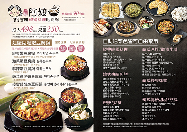 「江陵阿嬤강릉할매」韓鍋料理吃到飽每人$498元,酌收10%清潔費,用餐時間限時90分鐘吃到飽,12月1日正式開幕,開幕活動為12月1日至12月3日現場排隊前25組兩人同行一人免費,其餘一律享9折優惠,12月4日至12月31日還有兩人同行第二人8折優惠,活動詳情請見官方Facebook。