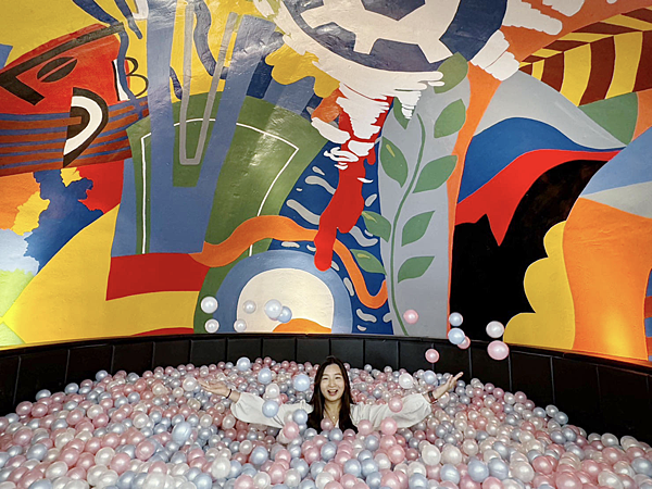 由15,000顆粉色及藍色的海洋球組成的夢幻球池,背景由三位國立高雄大學建築學系碩士班同學手繪創作,透過潑墨、不規則幾何、抽象元素結合不同色塊,呈現出巴塞隆納活力奔放的風格,不僅可以享受球池的樂趣,更是一個藝術氛圍拉滿的打卡熱點。