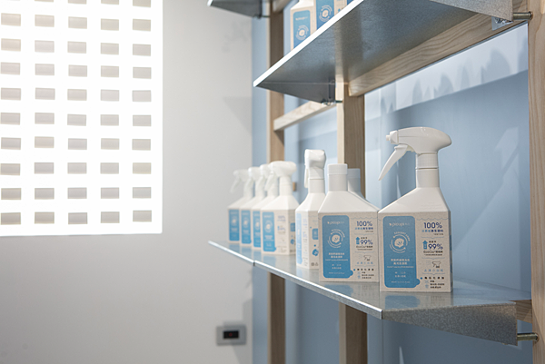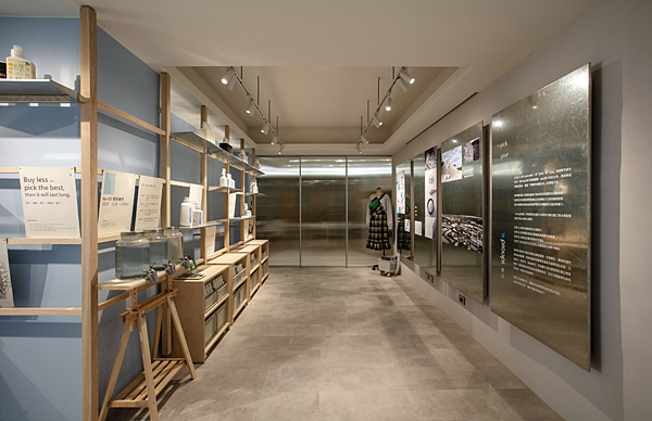 同時店內的層架與隔板,都是模組化與結構易拆解設計,不僅易於拆解或維修,也能節省廢棄拆解的時效,利於回收與再利用;除了商品展示之外,其中一面牆發揮巧思運用在製作過程時所產生的耗損空瓶,總計有 108 個,廢物利用化換成裝置藝術壁燈,儼然成為概念店中的獨特焦點。