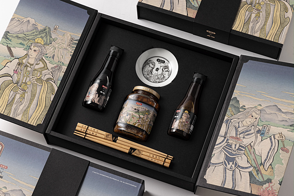 盒身以古典「書型盒」型態設計,瓶身印有素還真與葉小釵圖案,木筷上別出心裁地刻下素還真的稱號「清香白蓮」與葉小釵盛名「刀狂劍癡」,對狂熱的布袋戲粉絲而言,簡直是量身訂製的驚喜好禮。打開禮盒如同「開卷有益」,以置中對開的設計,呈現角色張力與浮世繪的魅力,更以義大利進口的美術紙做為禮盒印刷材料,展現古樸的藝術質感,內部黑色卡紙則襯托聯名醬油碟、木筷的精緻感與獨特性。由手提袋、盒身到內容物,細膩的製作彰顯禮盒的精緻度與收藏價值,即使油膏、蔭油、與XO醬都吃完了,禮盒與瓶子也會令人捨不得丟,想留下來當傳家寶。