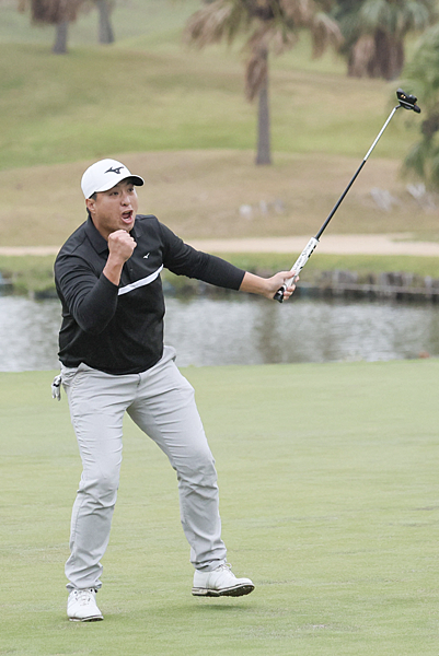 男子隊詹世昌(左)最後一洞打出好球後給場邊加油團飛吻致意(TLPGA提供_葉勇宏攝)