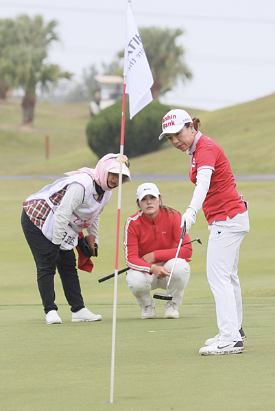 女子隊蔡佩穎(右)與王莉甯於果嶺上互相討論推桿路線(TLPGA提供_葉勇宏攝)