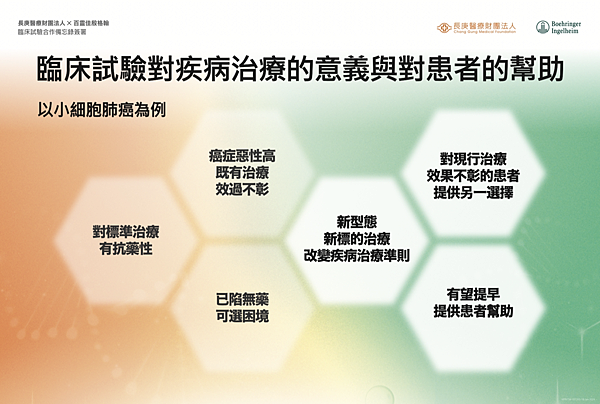 臨床試驗透過科學的方法找尋並確認新的治療方向,以對癌症患者達到真正效益,對於易復發或難治的廣泛性小細胞肺癌、「賈伯斯癌」神經內分泌腫瘤這些無接續治療、患者無藥可選的疾病更是重要。有別於非癌症治療藥物,癌症藥物早期臨床試驗,多嘗試新形態或新標的治療來改變或控制病情惡化的趨勢,以補足現行治療的缺口,或幫助患者更有效控制疾病。近幾年,癌症臨床試驗的發展也有加速的趨勢,有些治療若在第一期或第二期觀察到良好治療效果,有可能不用等到第三期臨床試驗,就可能通過核准,相較於一般審核程序提早2至3年就能讓更多的患者獲得幫助。因此,長庚醫療財團法人與百靈佳殷格翰簽署臨床試驗合作備忘錄,期許以雙方的優勢與資源,透過創新研發能改變某些特定癌症或疾病治療選擇有限、既有治療效果不彰、藥物具抗藥性,或無藥可選的困境。