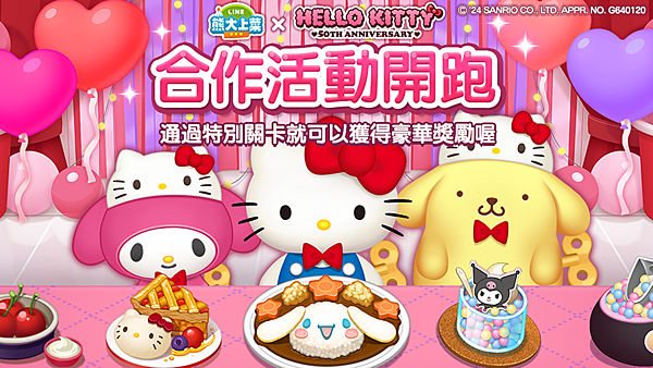 本次聯名活動中,將出現三麗鷗股份有限公司今年迎來50週年的超人氣角色「Hello Kitty」,並且將化身為「正裝打扮Hello Kitty」可愛登場!「派對Pompompurin」、「派對My Melody」、「派對Kuromi」和「派對Cinnamoroll」等超萌夥伴也會現身,還有期間限定特別關卡等各種充實的活動內容陪伴大家一起開心上菜拿好禮唷。