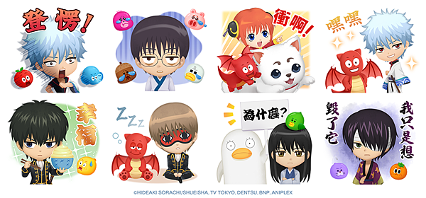 為了紀念本次合作活動,於活動期間內,所有完成遊戲內指定任務的玩家皆可免費獲得『銀魂』合作紀念LINE貼圖(共8張),一定要把握機會把限定貼圖帶回家喔!詳細貼圖取得方法,請參考遊戲內公告。