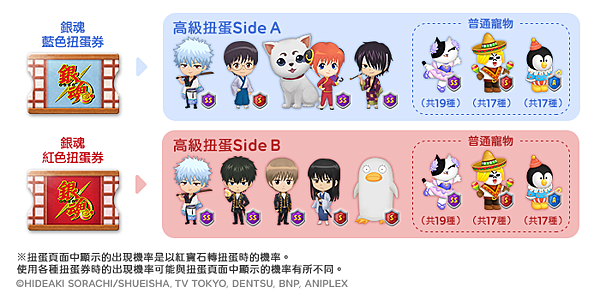 『銀魂』的角色們「坂田銀時」、「志村新八」、「神樂 & 定春」、「高杉晉助」、「土方十四郎」、「沖田總悟」、「桂小太郎」和「伊麗莎白」都將化身為「合作活動限定寵物」(※) 在高級扭蛋中登場囉!透過達成遊戲中各種合作活動任務所獲得的「銀魂藍色扭蛋券」和「銀魂紅色扭蛋券」都可以用來轉高級扭蛋喔!獲得獎勵的條件等詳細資訊請至遊戲內公告確認。把握機會讓『銀魂』角色們成為你的過關夥伴,一起在遊戲中闖關吧!