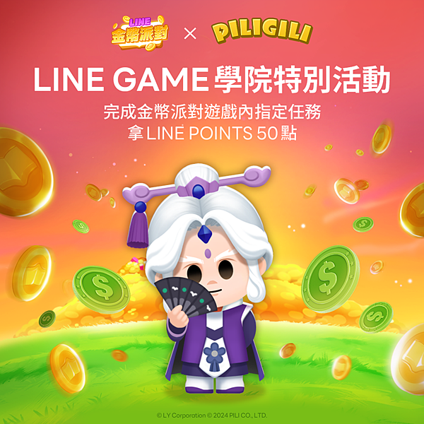 為了慶祝本次與『霹靂吉利』合作,遊戲也特別與『LINE GAME學院』合作推出特別登入及蒐集任務。只要在指定期間內登入金幣派對達1天、3天、5天,就有機會獲得各式虛寶以及LINE POINTS 10點獎勵。完成三本特別書本「琉璃仙境中合奏」、「雲渡山中修練武功」、「異度魔界中露營」有機會獲得50點,完成三本特別故事收藏「琉璃仙境」、「雲渡山」、「異度魔界」,還有機會再獲得50點,總計100點的LINE POINTS獎勵!詳細活動內容請見遊戲內公告。