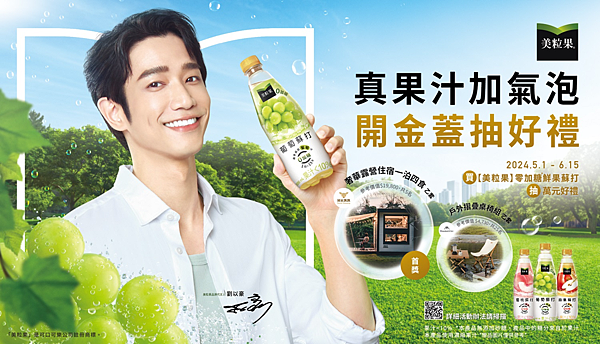迎接夏日,「零加糖」、「真果汁」、「綿密氣泡」的「美粒果」零加糖鮮果蘇打,提供消費者低卡、低負擔的優質飲品,葡萄、蘋果、蜜桃三款風味入口帶來自然清爽感受,為現代人繁忙緊湊的生活創造放鬆、舒緩的療癒時刻。5月16日(四)至5月19日(日),「美粒果」零加糖鮮果蘇打限時4天於信義區打造「城市中 自然里」,在都會喧囂中創建一方自然天地;今(5/16)「美粒果」全新代言人劉以豪更化身「自然里里長」驚喜現身,邀請消費者透過「美粒果」零加糖鮮果蘇打的清爽口感,盡情享受自然、純粹的放鬆體驗;活動期間,消費者只要於「城市中 自然里」任一主題情境區拍照打卡,即有機會抽中品牌代言人–劉以豪的親筆簽名照。此外,「美粒果」零加糖鮮果蘇打同步啟動「開金蓋抽好禮」活動,購買指定商品並掃描瓶蓋內QR Code或輸入序號就能參加抽獎,獎項包含奢華露營體驗等品味質感好禮!
