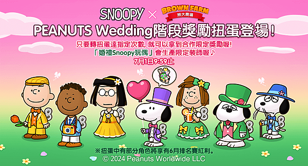 活動期間內登場的扭蛋中將會出現包括「婚禮SNOOPY玩偶」、「婚禮Charlie Brown玩偶」、「婚禮Marcie玩偶」等合作限定角色。依照進行扭蛋的次數還可以再獲得額外獎勵,最終階段獎勵為「婚禮Sally玩偶」小夥伴,大家快來把這些可愛的合作小夥伴帶回自己的農場,體驗PEANUTS Wedding的魅力吧!