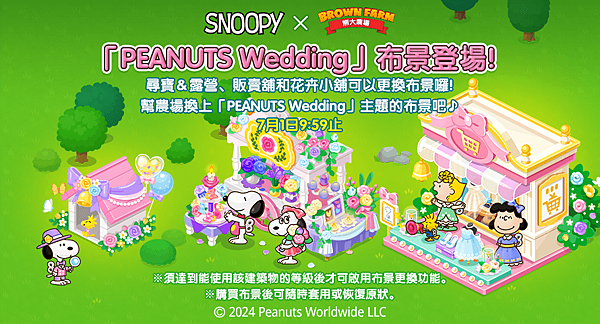 可改變農場建築物外觀的「PEANUTS Wedding」布景來囉!本次將推出尋寶&露營、販賣舖和花卉小舖的特殊布景,限時登場的布景須達到能使用該商店的等級才可啟用,布景取得之後可以永久使用,也能隨時更換或恢復成原狀,快來幫農場換上PEANUTS Wedding主題的布景吧。