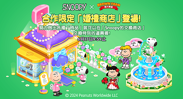 「婚禮商店」期間限定登場!只要製作出各種「飾品」就可以到「SNOOPY的交換商店」來兌換特別的合作道具。把PEANUTS的小夥伴設置在欄位中,還能夠讓小夥伴使用能力來幫忙生產,農友們一起來蒐集超可愛的小夥伴與裝飾吧!
