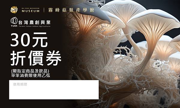 即日起,至霧峰菇類產學館購買門票時只要秀出此頁活動頁面,即可獲贈專屬實體折價券,