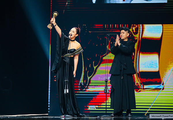 舞思愛以一襲高訂的黑色系單肩高衩、帶有原住民元素的禮服,搭配CARAT WANG 頂級訂製珠寶的秦帝國 -「冠履昌阜」耳環、戒指以及「秦韻風華」黑金彩寶手環吸睛全場,大氣亮麗上台領獎!