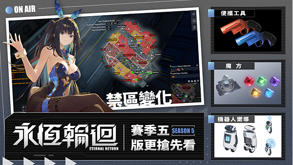 圖三:賽季5改版內容,左方為禁區變化,右上為新增便攜工具,右中為賦予實驗體不同加成效果的魔方,右下為機器人嚮導將會增加玩家獲得物品的手段