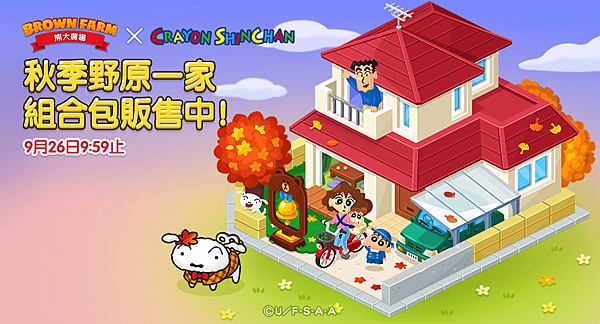 這次合作活動推出了特別組合包,內含小夥伴「秋季小白」、熊大的家房屋外觀「秋季野原家」及一張「合作限定精選扭蛋券」,在活動期間使用此扭蛋券時,小夥伴出現的機率與「蠟筆小新秋季出遊好日子」階段獎勵扭蛋相同,每人限購1組,千萬別錯過!
