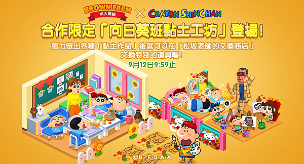 「向日葵黏土工坊」期間限定登場!只要製作出各種黏土作品就可以到「松坂老師的交換商店」來兌換特別的合作道具。把「蠟筆小新」小夥伴設置在欄位中,還能夠讓小夥伴使用能力來幫忙生產,農友們一起來蒐集超可愛的小夥伴與裝飾吧!
