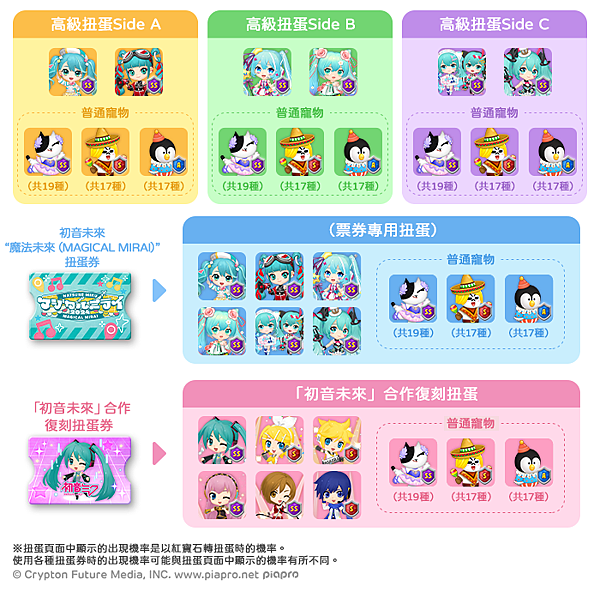 自2019年至2024年的「初音未來“魔法未來(MAGICAL MIRAI)”」歷代造型的『初音未來』將化身為「合作活動限定寵物」(※) 在高級扭蛋中登場囉!透過達成遊戲中各種合作活動任務所獲得的「初音未來“魔法未來(MAGICAL MIRAI)”扭蛋券」可以用來轉高級扭蛋!獲得獎勵的條件等詳細資訊請至遊戲內公告確認。把握機會讓各種造型的『初音未來』成為你的過關夥伴,一起在遊戲中闖關吧!