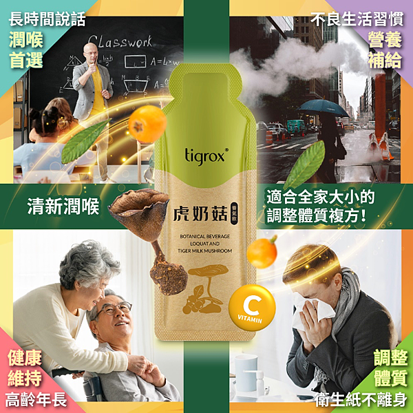 上市迄今累積銷售已超過5萬盒的tigrox虎奶菇養氣飲通過科學配方和現代生產工藝,保留了虎奶菇的所有營養精華。其成分含有虎奶菇、雪梨、甘草、維生素C、枇杷等多種複方成分,含有6大營養因子,像是多醣體、胺基酸、蛋白質、β葡聚醣、咖啡酸、對香豆酸,不僅對身體保健具有功效,口感味道也相當清甜潤喉。