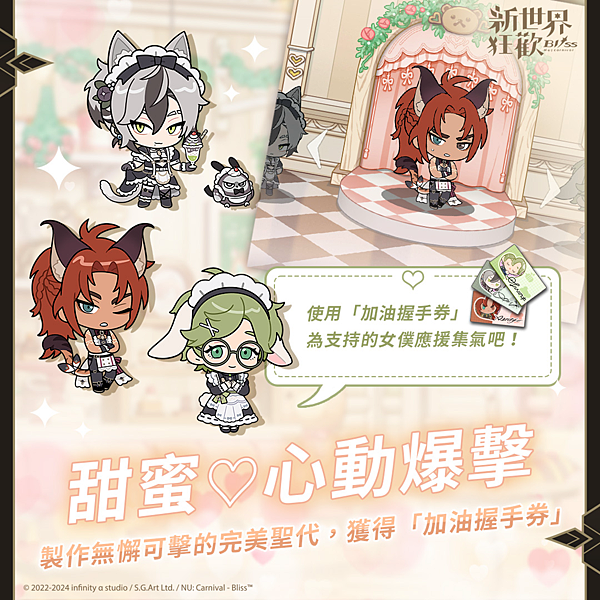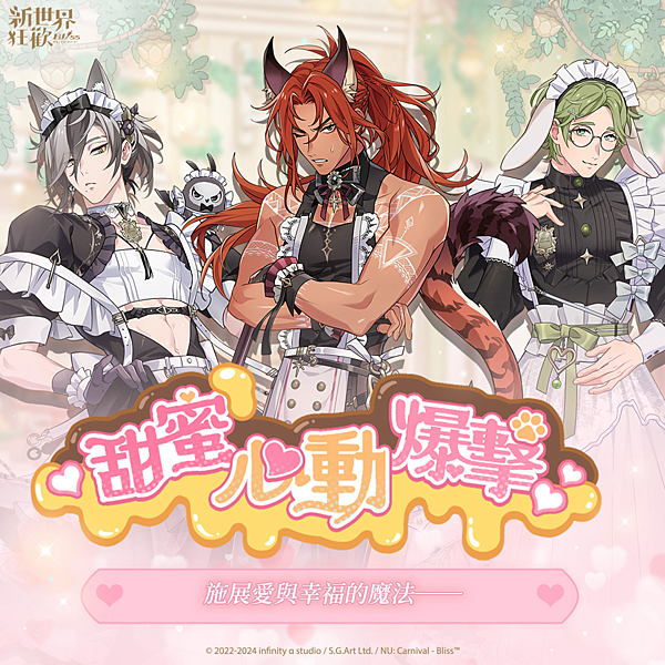 超人氣BL手遊《新世界狂歡 - Bliss》9月26日宣布,蜂蜜魔法女僕午茶店於卡萊因大陸正式開幕,「甜蜜♡心動爆擊」限時活動臉紅心跳登場!因一場意外,伊得、啖天和歛三人變成了擁有毛茸茸耳朵和尾巴的可愛女僕,在女僕訓練長奧利文的指導下,他們能否成功拯救岌岌可危的午茶店,並幫助店長順利通過即將到來的「女僕檢定」呢?一同前往蜂蜜魔法女僕午茶店,讓女僕們為你施展愛與幸福的魔法吧!