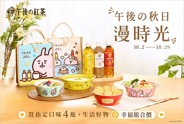 繼春季限定活動深受喜愛之後,這一次「午後の紅茶」也再次推出「午後の秋日漫時光」限時優惠活動!10月2日起凡於7-ELEVEN購買指定「午後の紅茶」口味4瓶,即可享有「卡娜赫拉的小動物」限定周邊或午後設計生活好物的特惠組合。包括檸檬紅茶搭配麥片碗、奶茶搭配焗烤鍋,以及原味紅茶搭配暖呼呼手提袋等今秋生活好物,為消費者的秋日午後增添幸福感。