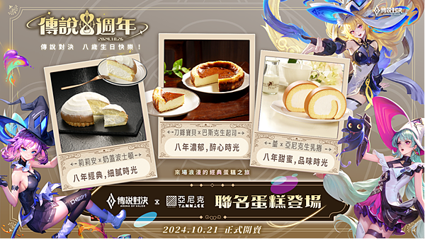 知名甜點品牌「亞尼克」與人氣手遊「傳說對決」首度跨界聯名,歡慶傳說對決八週年慶,與亞尼克攜手打造10月21日全新登場的「奶蓋波士頓派」,延續亞尼克經典的波士頓蛋糕體,搭配特製奶蓋及經典招牌北海道奶霜,香濃乳香中帶著清新的味覺饗宴,傳說粉衝這款就對了,邊打手遊邊吃甜點超級CHILL。本次聯名由傳說對決人氣英雄們搭配經典品項,一共推出三品聯名商品及活動。「莉莉安」與新品-奶蓋波士頓、「堇」搭配冠軍-亞尼克生乳捲、「刀鋒寶貝」則是隱藏人氣-巴斯克生起司,從限量期間限定包裝盒之外,連同蛋糕手提紙袋都有多款角色一同登場。