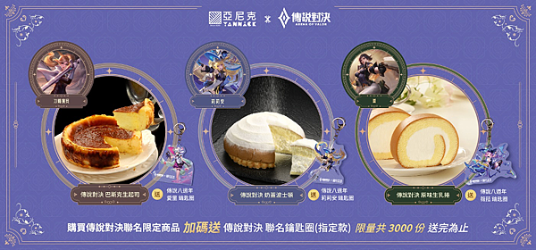 亞尼克經典品項「原味生乳捲」、隱藏版人氣甜點「巴斯克生起司」及全新登場「奶蓋波士頓派」三款甜點都有傳說對決八週年聯名包裝,期間限定在亞尼克官網-傳說對決特別企劃館、亞尼克全台20間門市及51台YTM蛋糕自動販機全都能買的到。三款經典甜點除了聯名包裝之外,限定賣場下單購買再加碼送人氣角色「愛里、薇菈、莉莉安」聯名人氣角色吊飾,價值179元/個,全通路共計限量3,000個,限量送完為止。想要蒐藏的傳說粉要趕快出動到亞尼克購買!