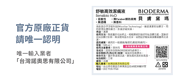 此外,因BIODERMA法國貝膚黛瑪無法對非官方輸入商品之品質、安全或儲存條件提供任何保證!為了保障消費權益,呼籲消費者請勿購買不明來源之商品,包含其他輸入業者、平行輸入、國際航空版、法國版、水貨,以保障權益與肌膚健康。