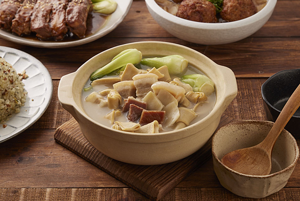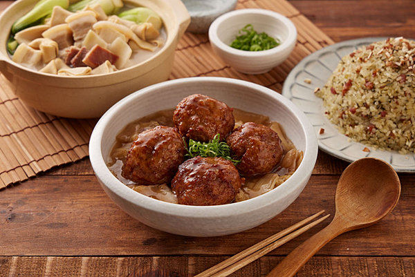不僅如此,年菜中不可或缺的「江蘇獅子頭」也加入了台灣前腿豬肉,將肥瘦比例揉合成拳頭大小的肉丸,並加入荸薺增加香脆,打造清爽美味的層次口感,搭配白菜的醬汁煨煮,肉質彈牙不油膩,湯汁鹹香帶甜,口口滿足。最後一道「黃金干貝櫻花蝦米糕」以香油爆香將蝦子的香氣融入每一口Q彈糯米,並舖上櫻花蝦增添色澤,以干貝點綴,整體海味鮮香濃郁。而「上海醃篤鮮」則選用南門市場知名的金華火腿與台灣豬五花肉一同細火慢燉,搭配鮮筍、百頁結的鮮甜,湯頭清甜香醇、層次豐富,再輔以青江菜的清爽,整體口感更加清新怡人,為整桌年菜畫上完美句點。