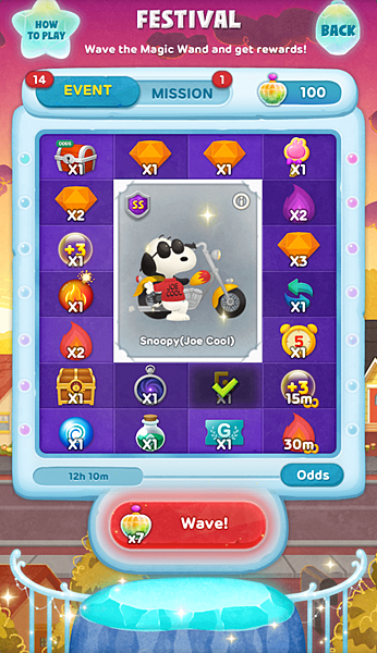 在活動期間內達成指定任務,即可獲得魔法粉末。利用魔法粉末來揮動魔法杖,就可以從活動頁面上隨機獲得SS級「Snoopy(Joe Cool)」或遊戲內的獎勵道具喔!