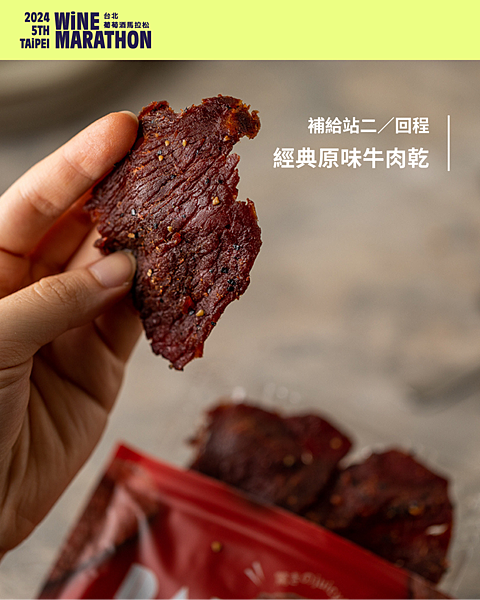 在 10K 品酒跑的回程路上,除了終點就在前方,還有更多美好的舌尖體驗!來自義大利與西班牙的紅葡萄酒,閃耀紫紅色的媚人香氣,冬日裡啜飲一口,感受自腳尖到髮尖的溫暖擁抱。襯著紅酒,來口如紅酒燉牛肉般濃郁多汁的牛肉乾、或是質樸Q彈的台式風味豬肉條,最後再以甜美軟嫩的蜂蜜蛋糕作結。