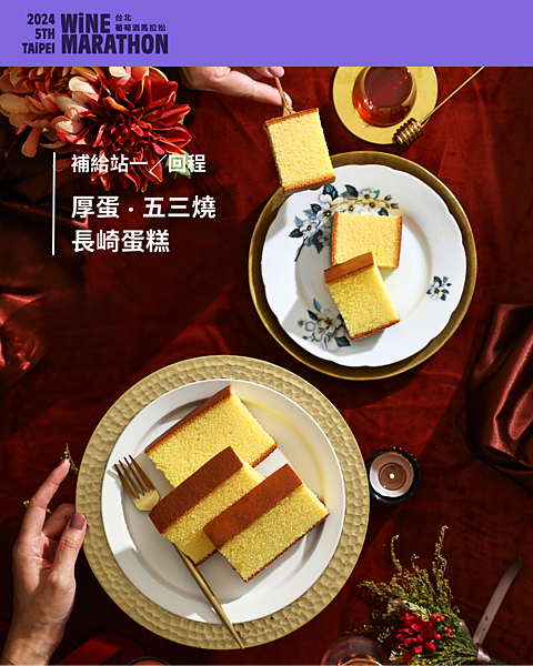 最後的壓軸補給將整趟環遊歐洲的品酒美味之旅帶到最高點,西班牙酒莊直接跨國大力支持,由瓦倫國際帶來三款南歐風情紅酒,不論是西班牙的丹魄,或是義大利的黑皮諾,皆有酒體平衡、順口的個性。搭配上如法式奶油質感的蔓越莓小蛋糕,或是擁有東方風情、蛋香味十足的長崎蛋糕,留下馬拉松旅程的愉悅與鮮明記憶!