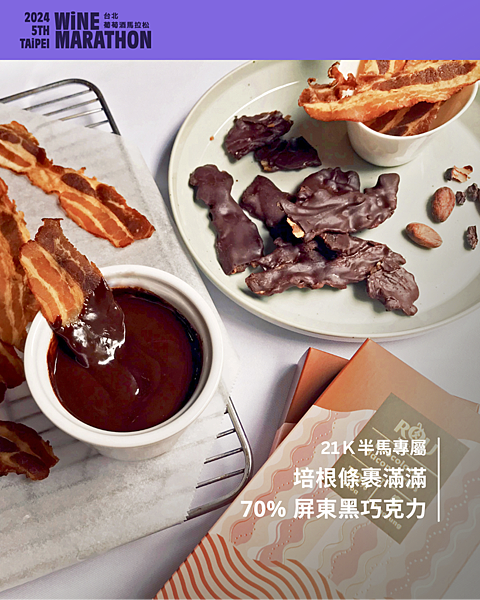 由 RÒU by T-HAM 與 K'INcacao金可可 攜手研發的台灣首款肉餡巧克力!選用台灣豬腹脅肉部、烘乾至酥脆低油口感的培根條,外層裹上屏東可可所製成的 70% 黑巧克力,完美詮釋經典培根巧克力的質感甘甜和鹹香,突破你對巧克力的美味想像。