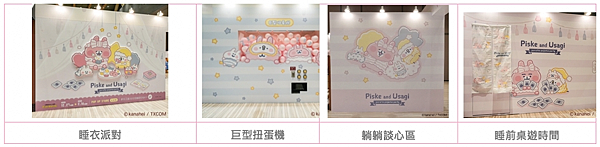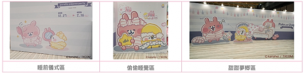 想要卡娜赫拉的小動物陪你入睡嗎?那就來「睡衣派對」與P助和粉紅兔兔一起談心、看書、吃甜點和玩桌遊吧!一到門口就有「立體P助與粉紅兔兔」抱著愛心迎接你,別忘了先來跟他們互動呦!噓~P助與粉紅兔兔帶著眼罩在「巨型扭蛋機」沈沈睡著了,不只可以試試手氣更能滿足你拍照慾望!接著來到「躺躺談心區」,蓋著小被子的粉紅兔兔和身穿整套睡衣的P助實在是太可愛了!有看到手拿牌卡的粉紅兔兔嗎?好想加入他們的「睡前桌遊時間」一起放鬆玩樂呀!逛一逛想睡了嗎?就到「偷偷睡覺區」與他們倆一起打瞌睡吧!接著看到正在「睡前儀式區」梳頭的粉紅兔兔,梳完照照鏡子舒服秒入睡!最後換好睡衣、拿著娃娃一起到「甜甜夢鄉區」甜甜入睡嚕!