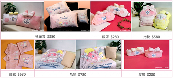 讓P助與粉紅兔兔陪你一夜好眠唷!首先換上粉色長袖看書、躺躺及趴趴等三款「睡衣」,舒服自在的材質讓你想穿一整天呢!再戴上兩款角色滿版大臉「髮帶」,瀏海、碎髮通通交給他們吧!別忘了裝上五款一起入睡、一起看書和P助與粉紅兔兔大臉等「枕頭套」,甜甜美夢不能少了他們!有光就睡不著嗎?戴上把光線通通阻隔掉的P助與粉紅兔兔造型「眼罩」,上面凸出的蝴蝶結和耳朵超級卡哇伊!氣溫逐漸下降!就讓躺躺談心、蓋被被入睡兩款材質鬆軟「毛毯」為你對抗寒流吧。粉絲必收!兩款P助與粉紅兔兔穿著粉、黃色條紋睡衣「抱枕」,上頭還有立體蝴蝶結和球球呢,真是太可愛了!