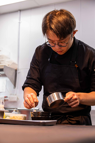 主廚大方分享挑選食材秘訣,甜點採用了友善動物福利的森德綠雙效蛋,又名「奔跑蛋」,來自自由奔跑的母雞所生,蛋香純粹且自然,象徵著對土地與生命的尊重。希望賓客能在品嚐這道甜點時,感受到一份來自田園的愉悅與溫暖。