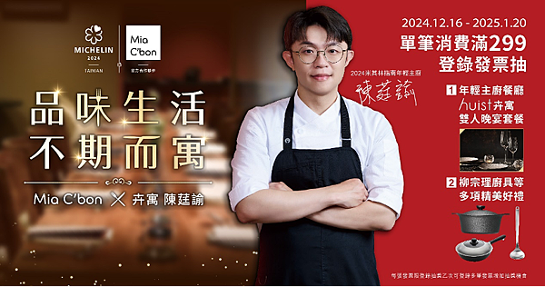 想要親自品嚐星級饗宴,即日起~2025年1月20日,只要到Mia C'bon門市單筆消費滿299元,上網登錄發票,最大獎可以享用由Mia C'bon x 卉寓陳莛諭主廚聯手打造的2025情人節星級雙人晚宴,體驗超乎想像的味蕾驚喜。每筆發票限登錄1次,登錄越多筆發票,中獎機率就會越高!