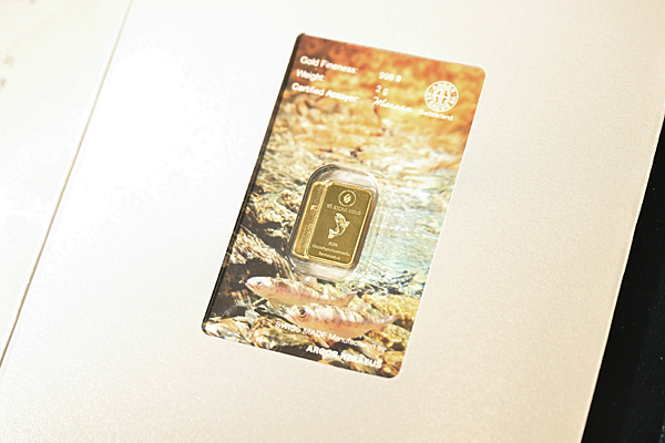 聖石金業集團日前取得雪霸國家公園管理處臺灣櫻花鉤吻鮭圖片授權後,推出典藏的「臺灣櫻花鉤吻鮭紀念條塊」。聖石金業集團/提供