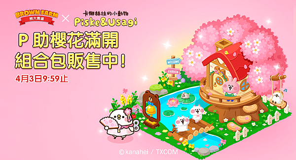 這次合作活動推出了特別組合包,內含「櫻花 P助」小夥伴和「粉紅兔兔的櫻花樹屋」熊大的家房屋外觀,另外還包括一張「合作限定精選扭蛋券」,在活動期間使用此扭蛋券時,小夥伴出現的機率與「卡娜赫拉的小動物與春花」階段獎勵扭蛋相同,每人限購1組,千萬別錯過!