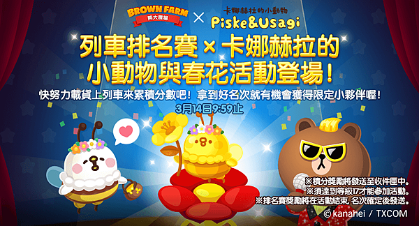 《LINE 熊大農場》將在限定期間內舉辦「卡娜赫拉的小動物與春花」列車排名賽的活動!玩家們透過完成指定貨物的列車運送任務,累積積分來爭取名次,將有機會獲得合作限定的「蜜蜂 P助」小夥伴,大家一定要踴躍參加喔!