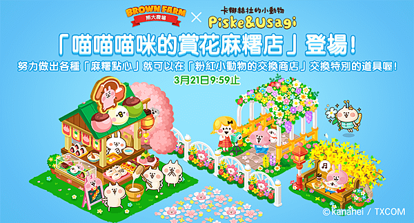 「喵喵喵咪的賞花麻糬店」期間限定登場!只要製作出麻糬點心就可以到「粉紅小動物的交換商店」來兌換特別的合作道具。把「卡娜赫拉的小動物與春花」小夥伴設置在欄位中,還能夠讓小夥伴使用能力來幫忙生產,農友們一起來蒐集超可愛的小夥伴與裝飾吧!