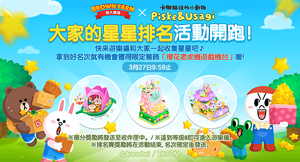 快來熊大的遊樂場和大家一起收集星星拿獎勵!依據活動的排名以及達成的分數,就有機會獲得合作限定裝飾「喵喵喵咪的鬱金香船」、「粉紅兔兔與春花遊行花車」等限定道具!