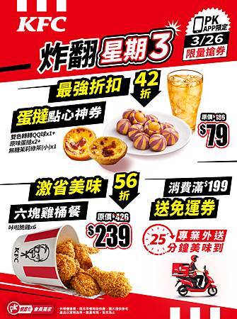 肯德基3/26【PK APP限定 炸翻星期三 優惠一覽表】
