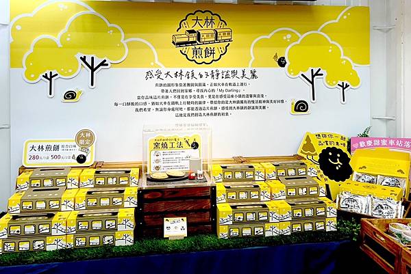 拾粹院大林煎餅包裝取自大湖農場的甜蜜火車站為基礎,展現了百年糖業的風華,外觀設計可看見在火車一節節的車廂內欣賞綿延的金黃花海,展現黃花風鈴木如朝日般的旺盛生命力,加上大林慢城的彩繪蝸牛等大林在地元素,極富設計創意,充分展現大林特色,成為許多到訪遊客的必買伴手禮。