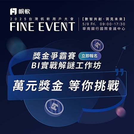 此外,FineEvent 2025特別加碼舉辦「獎金爭霸賽:BI實戰解謎工作坊」,以創新互動形式讓參與者親手體驗數據分析的魅力。參賽者將面對真實業務場景,運用FineBI進行即時分析與決策制定。萬元獎金等待技術高手帶回家,活動名額有限,報名從速。