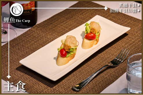 鯉魚 【主食】XO‧干貝Tapas 生食級鮮干貝與頂級干貝XO醬雙重饗宴,搭配酥烤法棍與清脆蘿蔓,口味層層分明,鮮甜海味與清新口感交織,感受東西文化的味蕾碰撞。 |