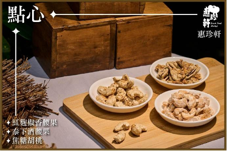 甜點部分,由大稻埕名店「昭和浪漫洗濯屋」攜手「百恆藥材」,將桂花酸梅湯轉化為冰淇淋,「桂花酸梅冰淇淋」酸甘平衡、香氣悠長,延續昭和老宅的日式浪漫。壓軸點心由創立60年的「惠珍軒」研發「金豐味烘焙堅果」,低糖無油、層層低溫烘焙,酥脆爽口,是本草派對的完美句點。
